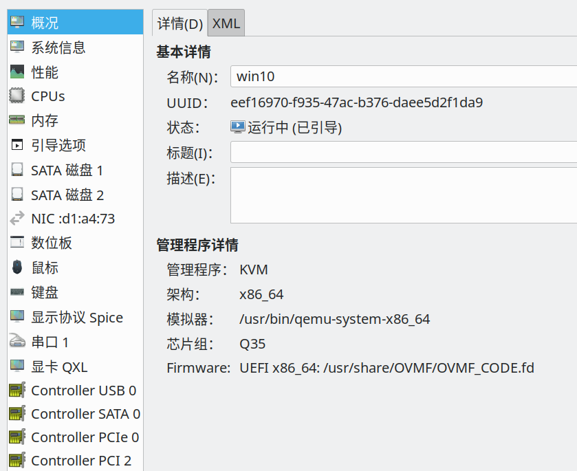 注意配置芯片组为Q35, 性能更优,使用UEFI 的fd文件