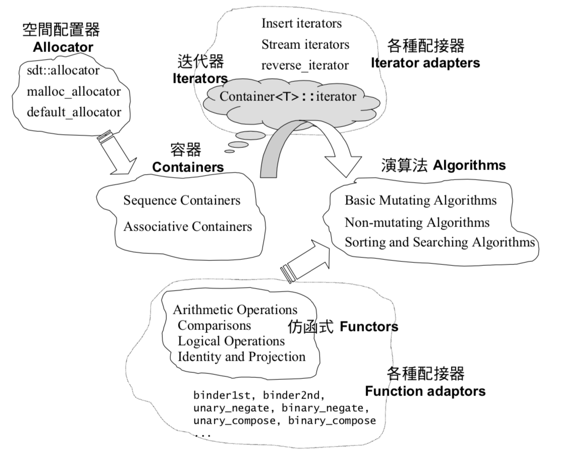 Container通过Allocator取得数据存储空间,Algorithm通过Iterator存取Container内容,Functor协助Algorithm完成不同的策略变化,Adapter可以修饰Container、functor和iterator等等,起到一个连接、套接的功能。