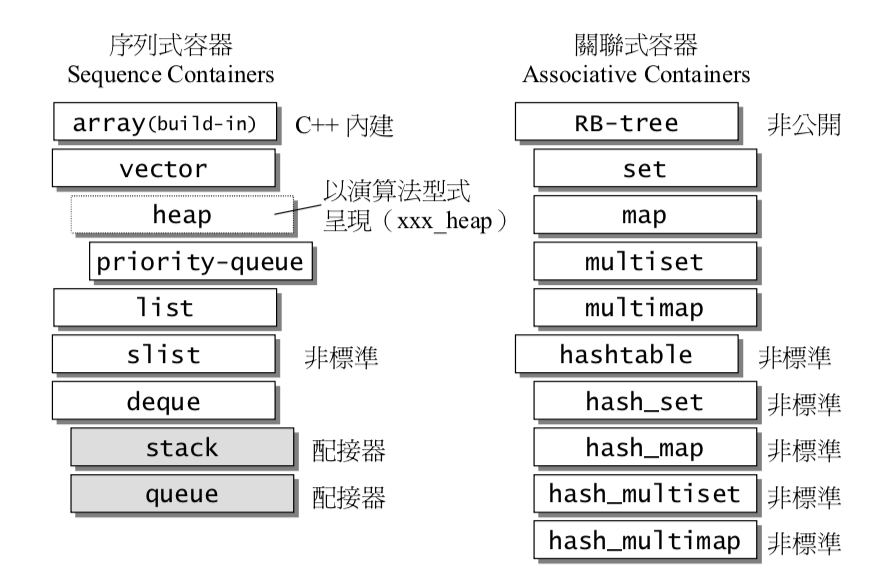 - C++ standard定案前,所规范的STL头文件,例如vector.h, deque.h, list.h等