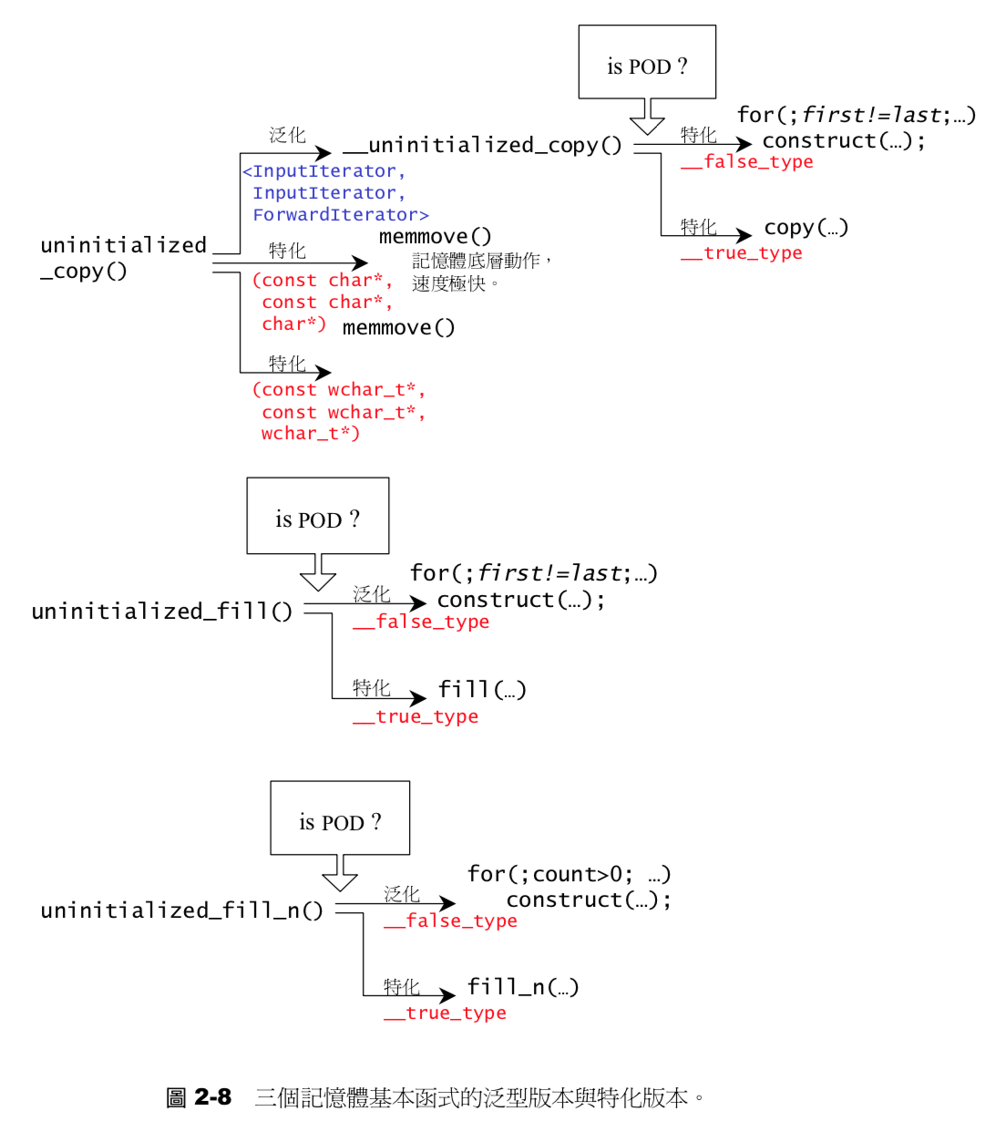 上述三个函数都会判断要构造的类型是否是POD(Plain Old Data),即是否是标量型别(scalar type)或者是传统的C struct型别,最主要个的特点是其构造和析构都是不太重要的(trivial)的,可以使用fill函数进行内存填充。对于非POD类型会使用construct函数进行构造。流程如下图所示: