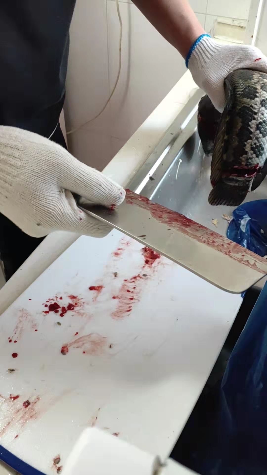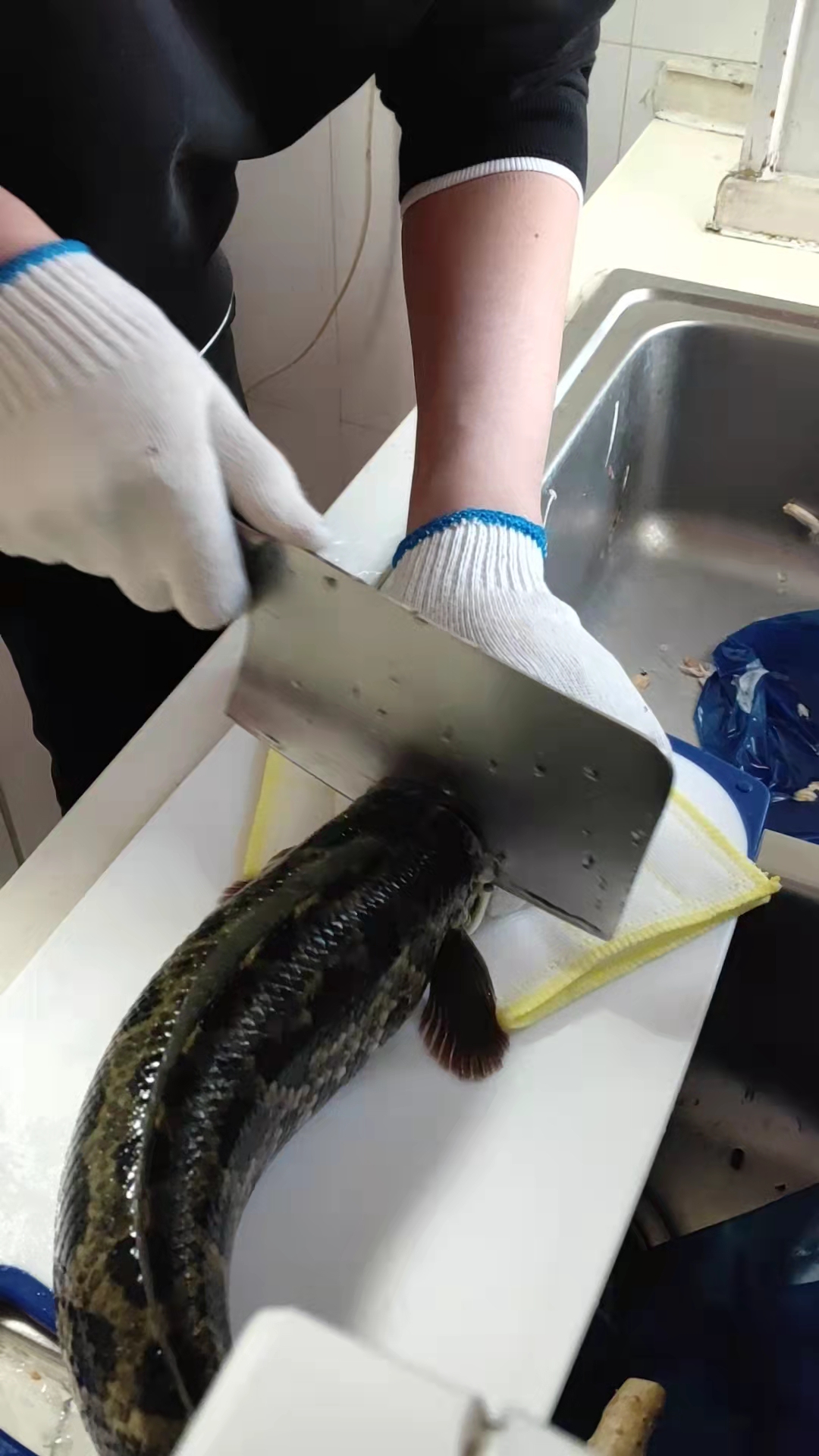 蒙住鱼的头部,先砍断鱼的后脖颈,减少它的痛苦。再斩断尾巴,放出血液,减少鱼腥味。