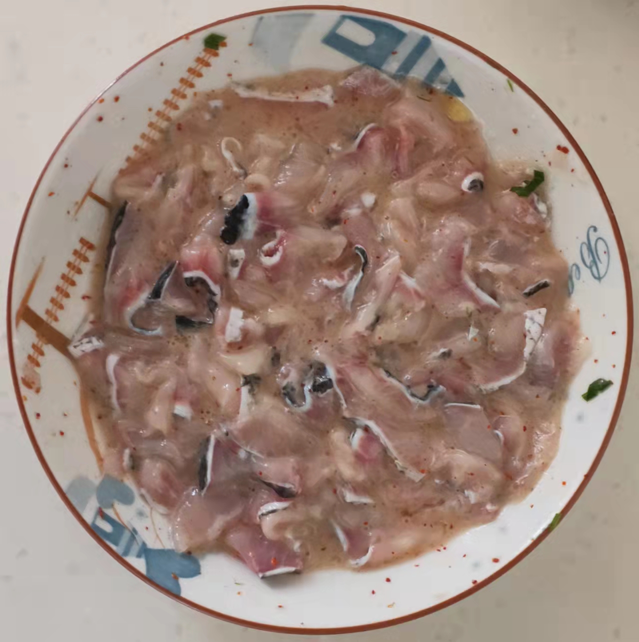 • 放入鱼片,涂抹均匀,腌制5分钟