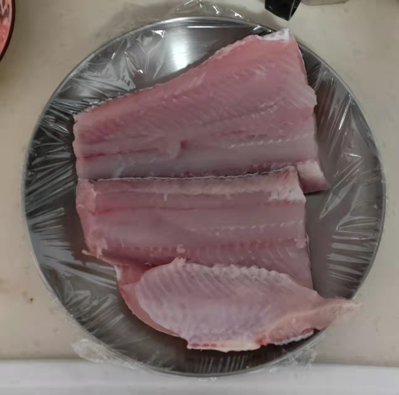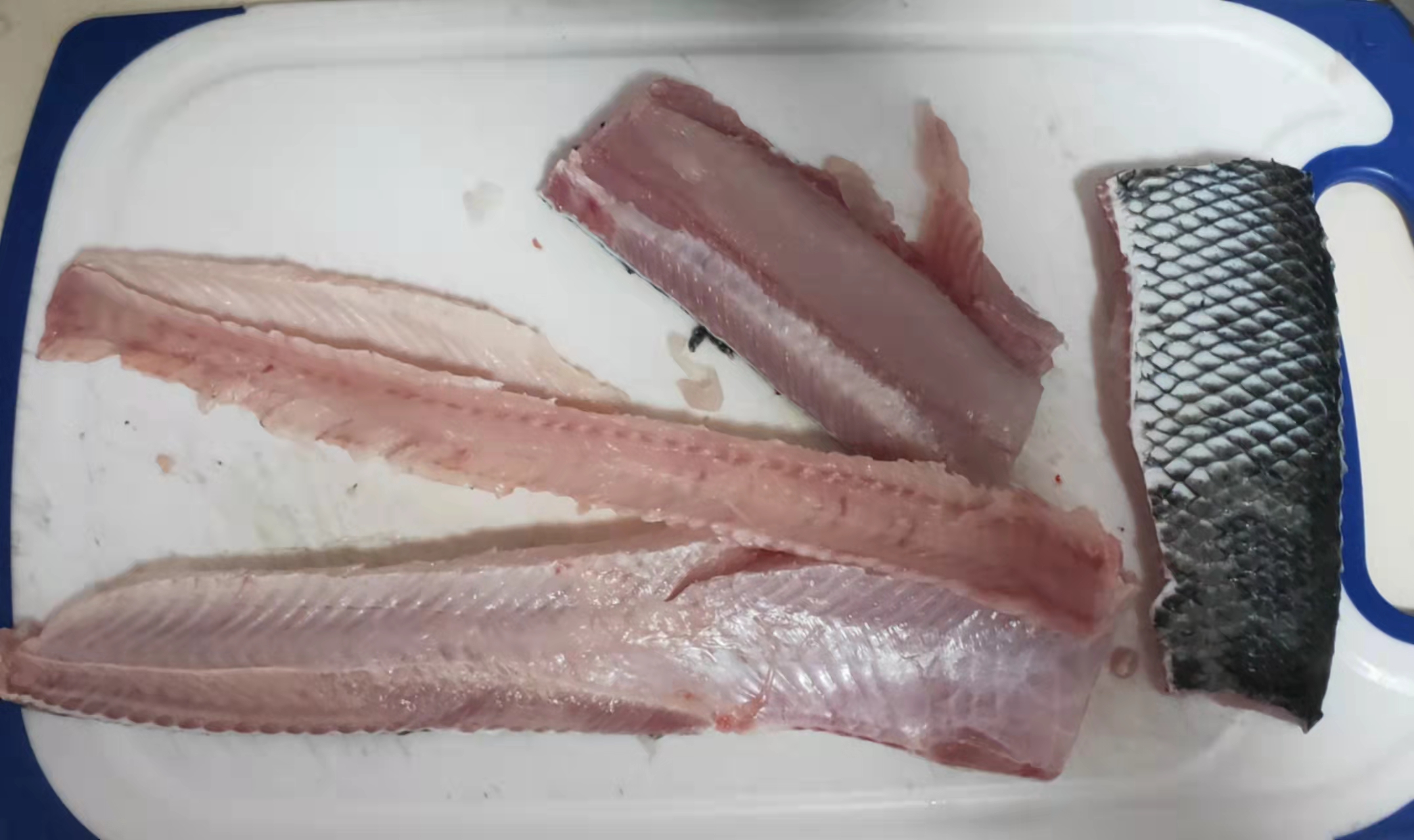 用刀从鱼背劈下大片鱼肉,再取出鱼腹部的排刺(刀工太差,没有处理好)