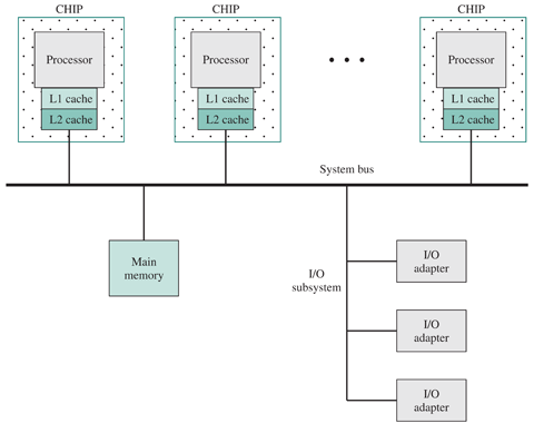 指将两个或多个处理器(核)组装在同一个芯片上,又称为chip multiprocessor,包含L1指令和数据高速缓存、L2高速缓存、L3高速缓存。