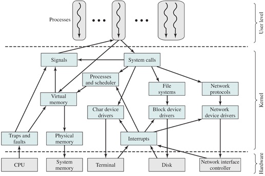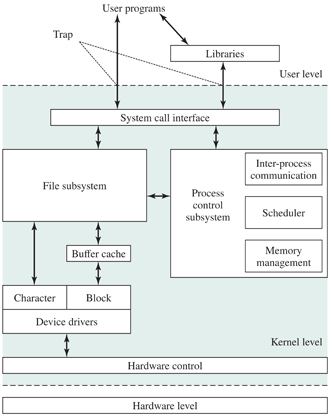 分为三个层次:硬件、内核和用户,操作系统通常称为系统内核。用户可以直接调用操作系统的服务,也可以通过库进行调用;系统调用接口是内核和用户的边界。系统被划分为两个主要的部分: