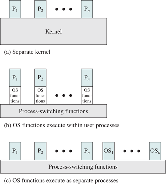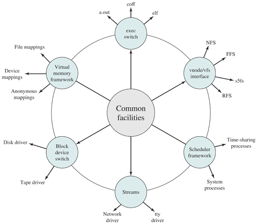 现代UNIX系统通过模块化的方式编写小核心的软件,这些软件可以提供进程需要的功能和服务,每个外部的圆圈代表相应的功能和多种方式实现的接口。