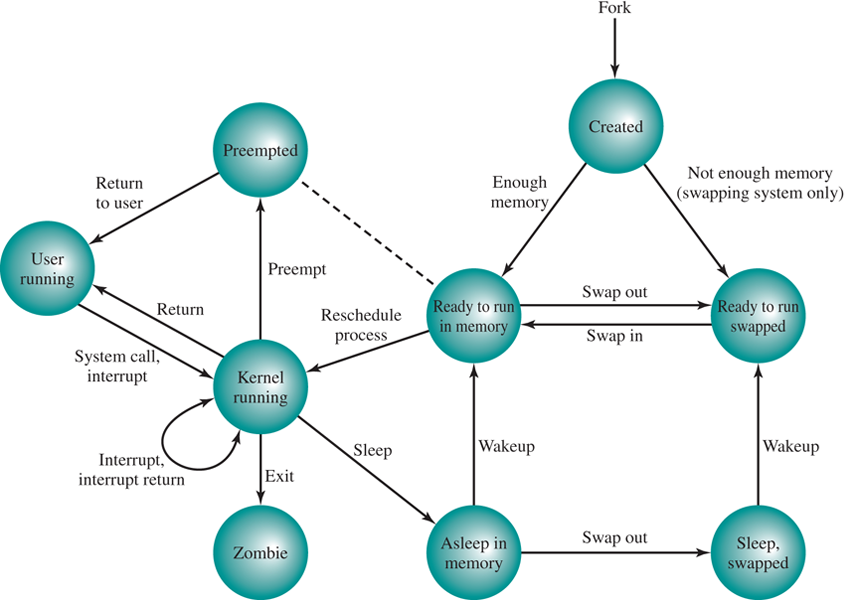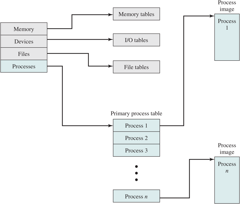 | 内存表 | 用于跟踪内存和外存,包含如下的信息, 分配给进程的内存 分配给进程的外存 内存块或者虚存块的任何保护属性,如那些进程可访问共享内存区域 管理虚存需要的各种信息 |