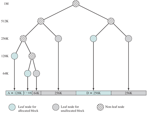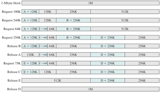 页面分配,内核维护一系列大小固定的连续页框组,一组可以包含1、2、3、8、16或32个页框,当一页在内存中被分配或者解除分配时,使用伙伴算法来分裂或者合并。伙伴算法示意图如下: