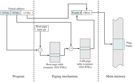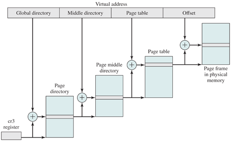 Linux使用三级页表结构,如下图所示。其中Global directory只有一页,每个活动进程对应一个Global Directory,必须存在于内存中。Middle directory和page table都可能是多页。