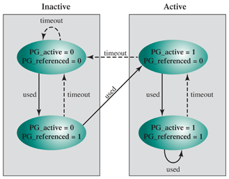 在2.6.28之后,引入了新的页面置换算法,分割LRU。页面关联两个状态PG_avtive和PG_referenced。并被分为两大类,激活和非激活,使用链表对他们进行管理。非激活链表中的一页,第一次访问PG_referenced设置为有效,再被访问一次,会从非激活链表中移动到激活链表;若两次访问时间间隔太长,PG_referenced会被重置为无效;同样的激活链表在超时之后会被放到非激活链表中去(状态转移如下图所示)。判断超时进行修改的工作由内核驻留进程kswapd在后台周期性执行。在非激活状态的链表中会被LRU的页面置换算法进行置换。
