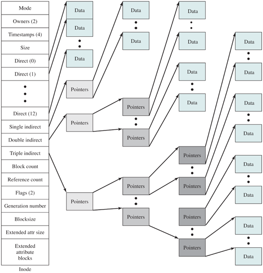 文件分配是以块为基础完成的,根据需要进行动态分配。在UNIX中索引节点包含直接指针和三个(1,2,3级)间接指针(见上图)。他们依次可以索引\(12\),\(512\),\(512*512\), \(512*512*512\)个块。