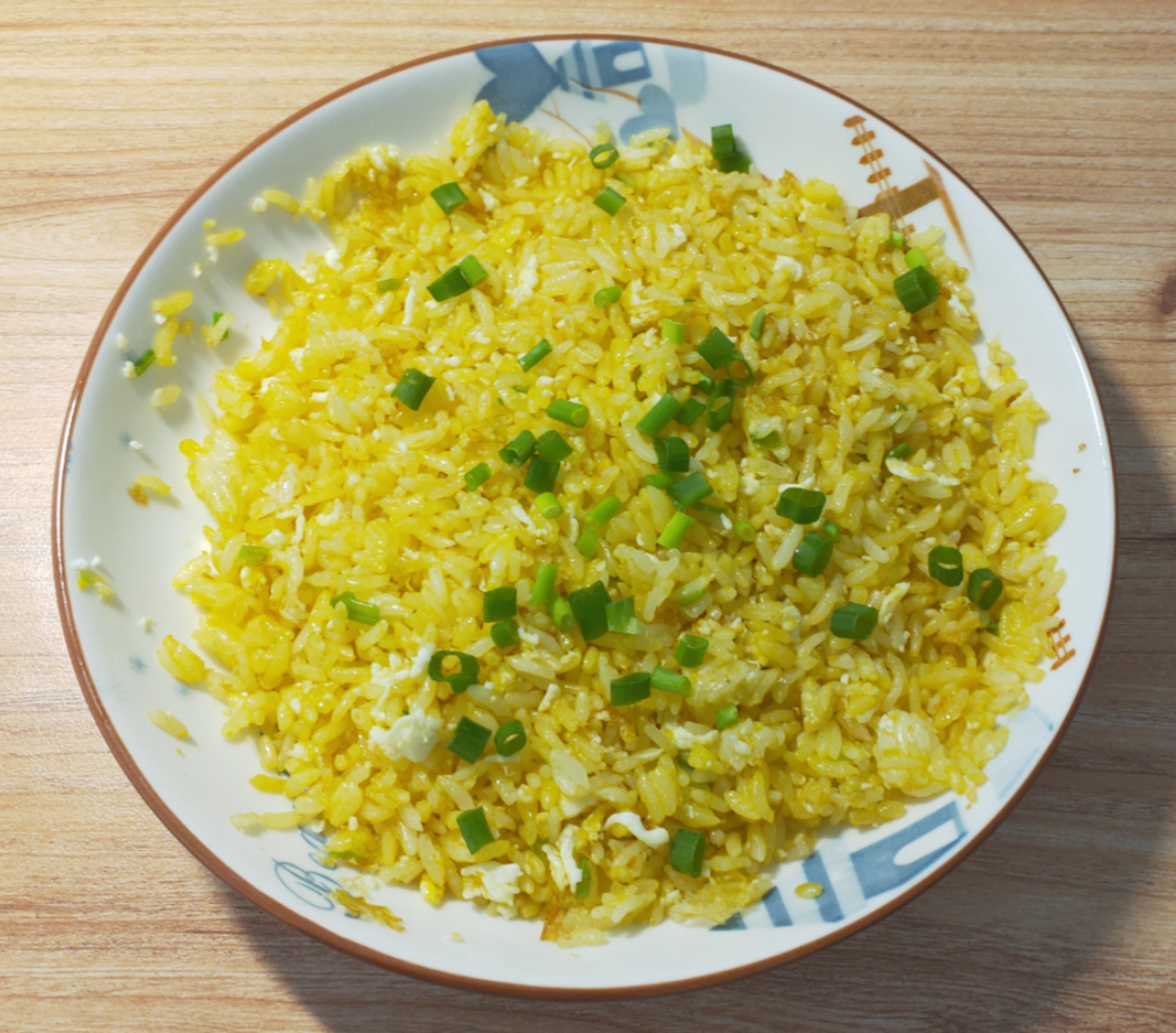 黄金蛋炒饭,鸡蛋黄液先包裹米饭粒,再下锅炒。缺欠火候,香味不太足,但是已经比较干巴了。