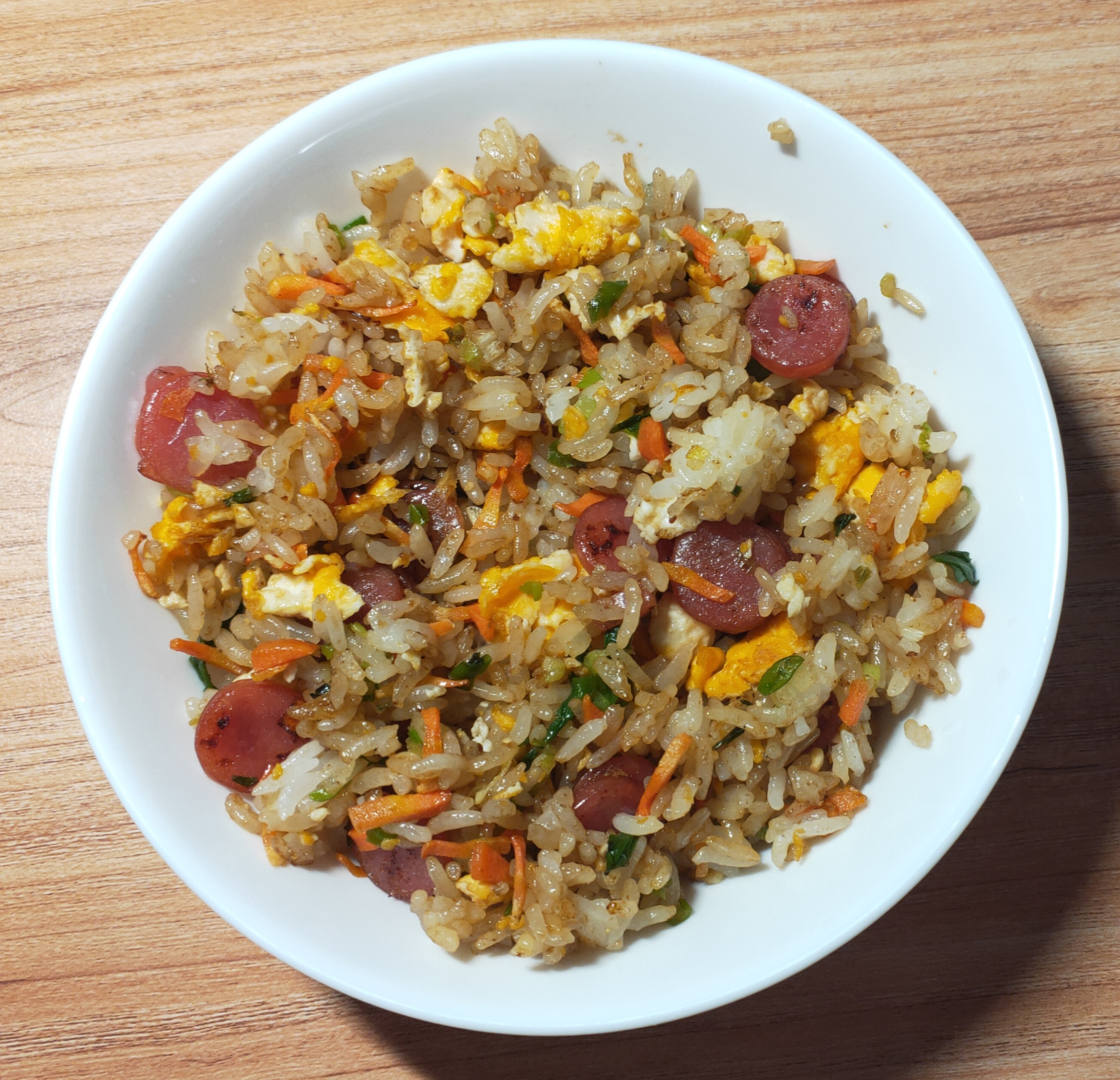 - 香肠炒的时间太久了,米饭炒的时间短。