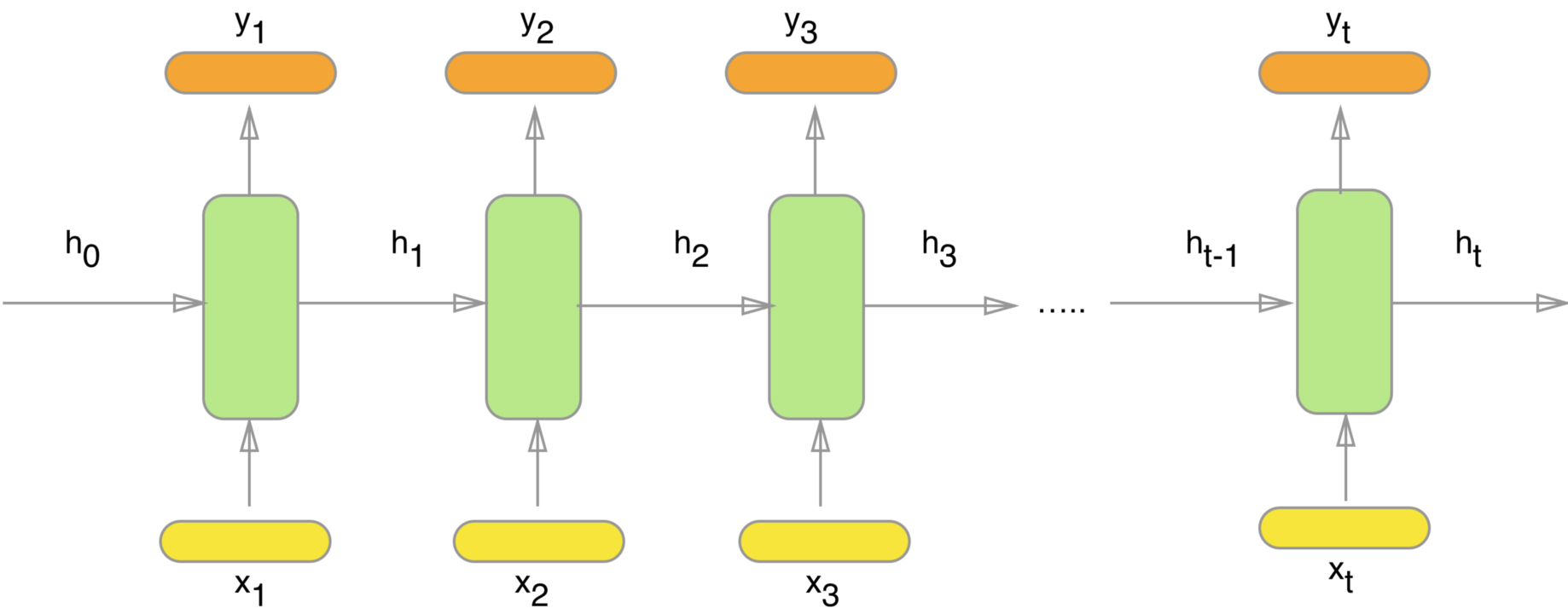 每个节点的\(h_t\)都是根据前一个\(h_{t-1}\)和\(x_t\)计算得到的 \[ h_{t}=f\left(W^{(h h)} h_{t-1}+W^{(h x)} x_{t}\right) \]