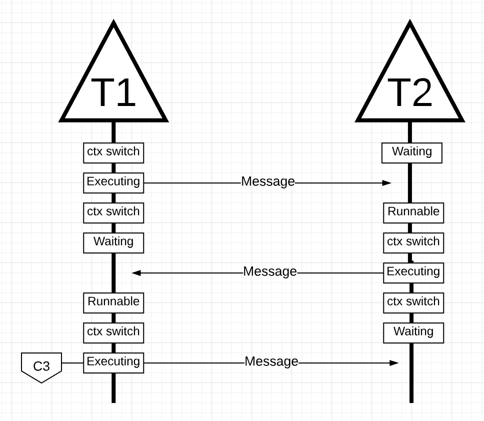 两个线程在此过程中发生了多次上下文的切换,这些切换都需要时间。并且切换是有可能发生在多个核心之间,还可能因为没有告诉缓存没有命中而造成额外的时间开销。
