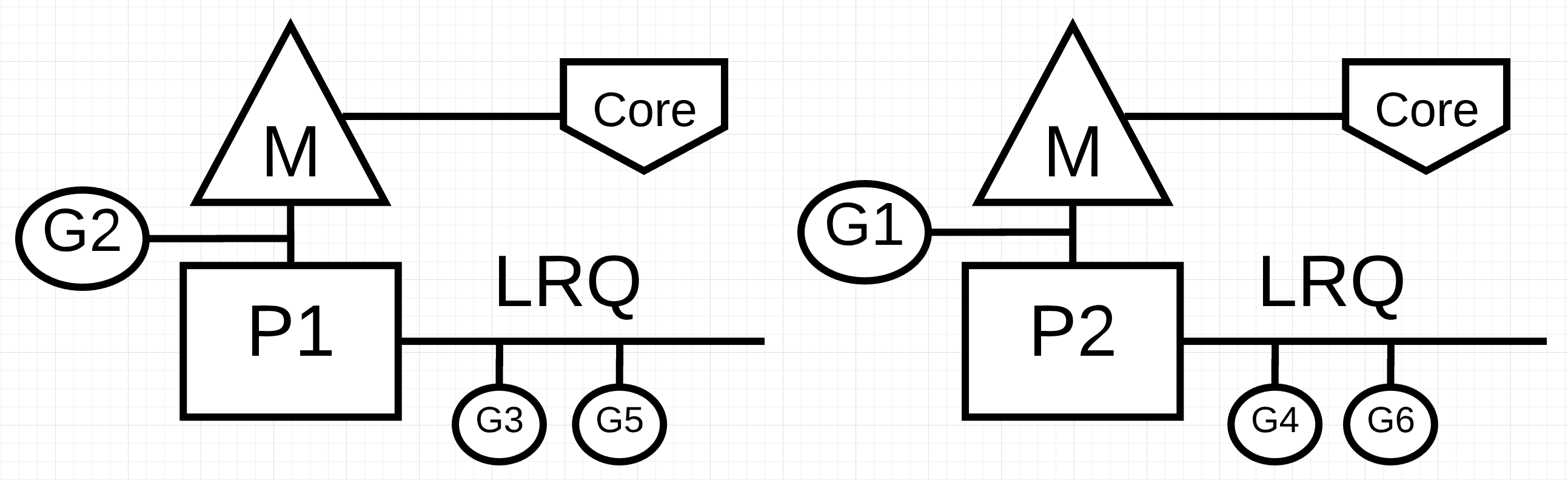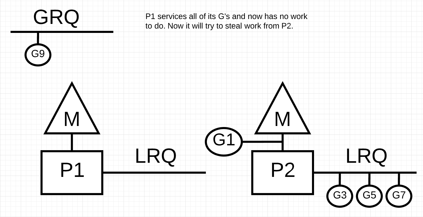 工作窃取有助于在所有的P上平衡Goroutines,从而更好的分配工作并高效的完成工作。例如下面的情况,P1没有可以执行的Goroutines,但所有处于Runnable的G都在P2的LRQ和GRQ上。这个时候P1需要偷一些工作。