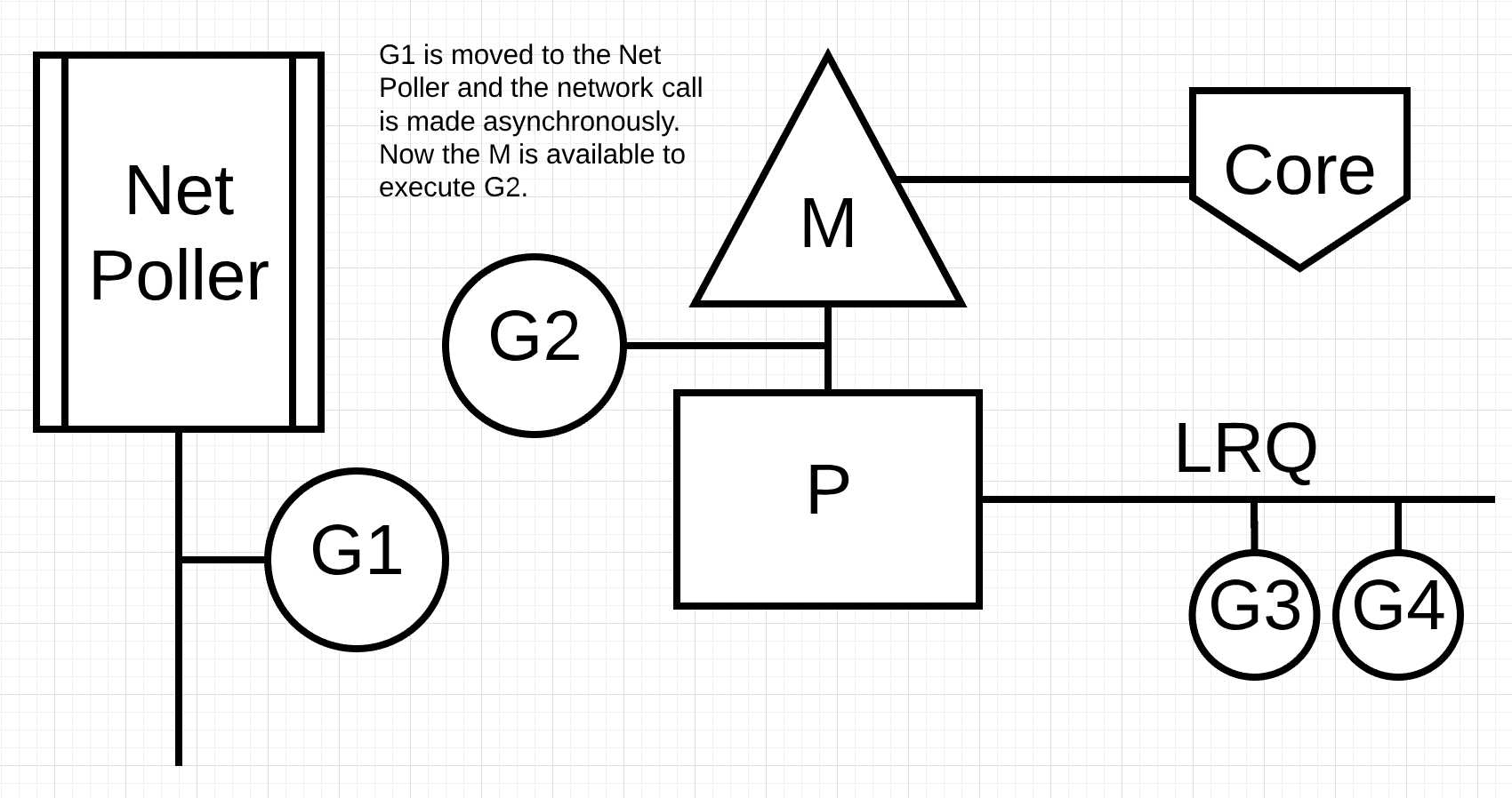 例如,G1正在执行,掉用了NetPoller的异步系统调用,那么G1将会给挂到netPoller的阻塞队列中去,Go Scheduler将会安排LRQ中的G进行执行。当G1的异步系统调用执行完成,G1将会从NetPoller中移回到LRQ中。