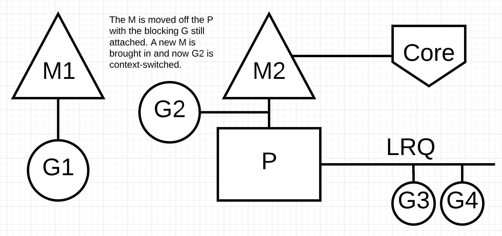 例如,G1正在执行,调用了同步系统调用,此时Scheduler会将P1分配到M1换掉,换成一个新的M2,M1上继续执行折被阻塞的G1,等G1的系统调用结束,他将会回到P1的LRQ中。M1也将会被留着下次出现这种情况时进行替换。如下图: