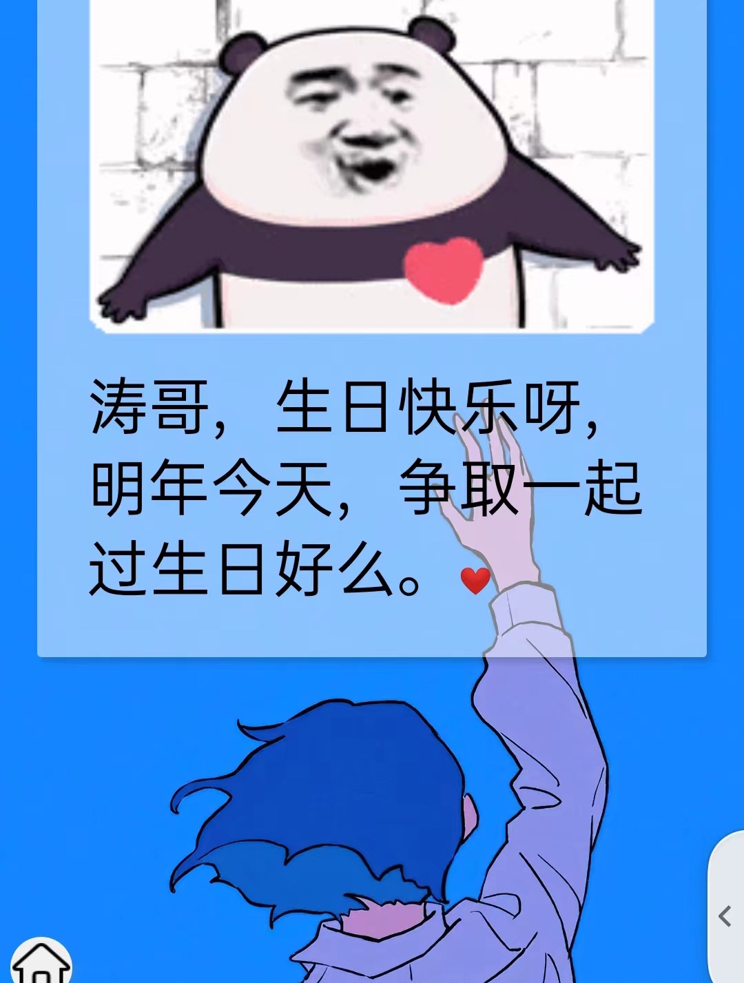 生日快乐,景涛! Posted on 2022-04-18 Edited on 2022-08-10 In 生活 Views: 过去一年,经历了实习、秋招、毕业、入职... 这一年 实习~! 秋招~~!! 毕业~~~!!! 入职~~~~!!!! 疲惫过,迷茫过,狂妄过,自卑过,抑郁过,开心过。 从学校到公司,3.5公里的距离,是那么长,又那么短。 由衷感谢那些陪伴我,支持我,体谅我,认可我的伙伴们,身边有了你们,让我的前行充满力量。 生日前夕 感谢贵哥的热情款待,益武的拍摄指导,再次感谢师兄对我毕设的无私帮助! 生日当日 十分感谢邱子和小林送来的祝福,这年你25,我26,凑在一起是256;期待512时,再讲你我的故事。 也十分感谢邱子在毕业前夕的鼓励与安慰! 生日与你 最后还有你,我们会相见的,对吗? 我们会一起, 在海之畔,看潮起潮落,吹海风,晒太阳, 在山之巅,看日落星辰,观雪景,看麦田。