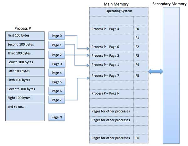 Page address is called logic address and represented by page number and the offset. \[ LogicalAddress = PageNumber + PageOffset \] Frame address is called physical address and represented by a frame number and the offset. \[ PhysicalAddress = FrameNumber + PageOffset \] A data structure called page map table is used to keep track of the relation between a page of a process to a frame in physical memory.