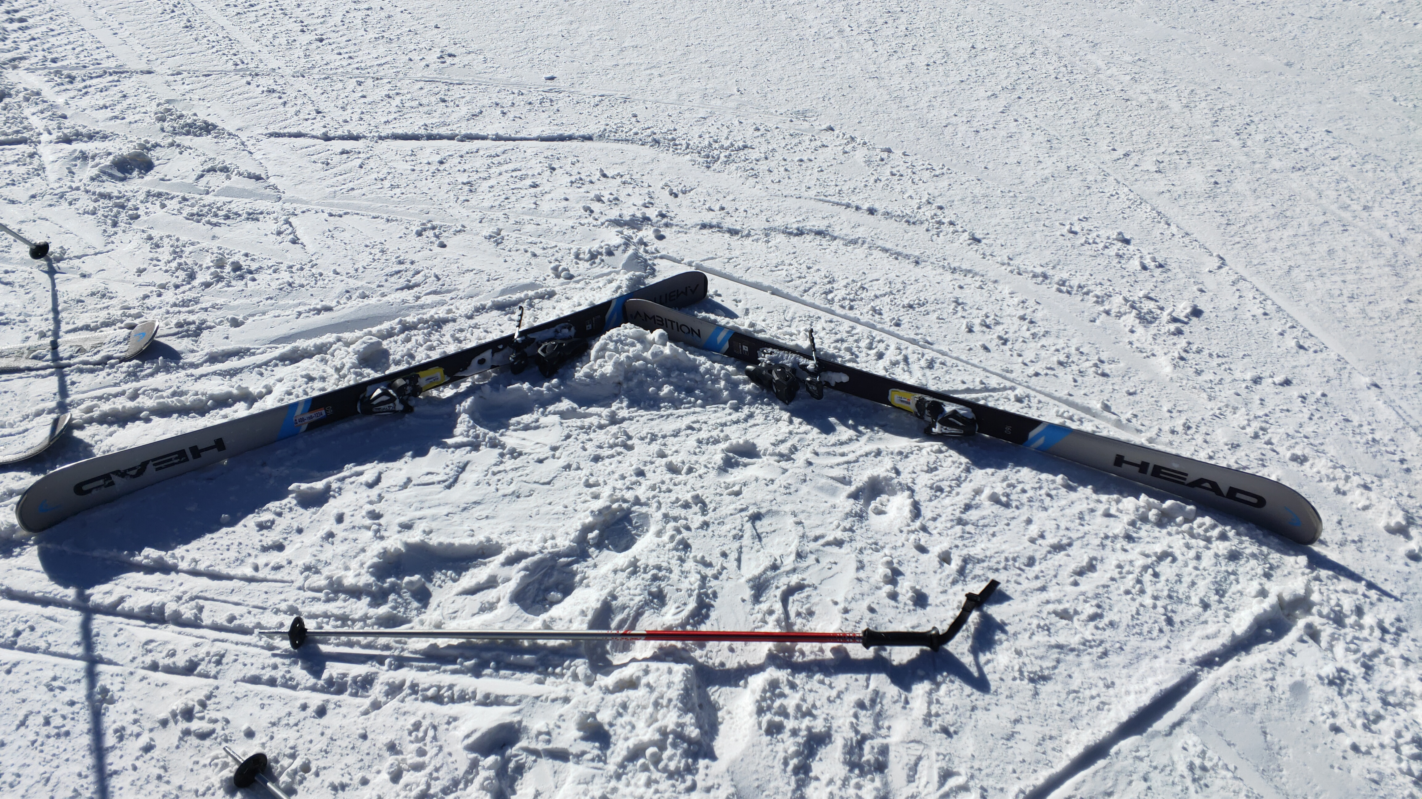 摔倒之后,雪板的姿势,根本起不来。