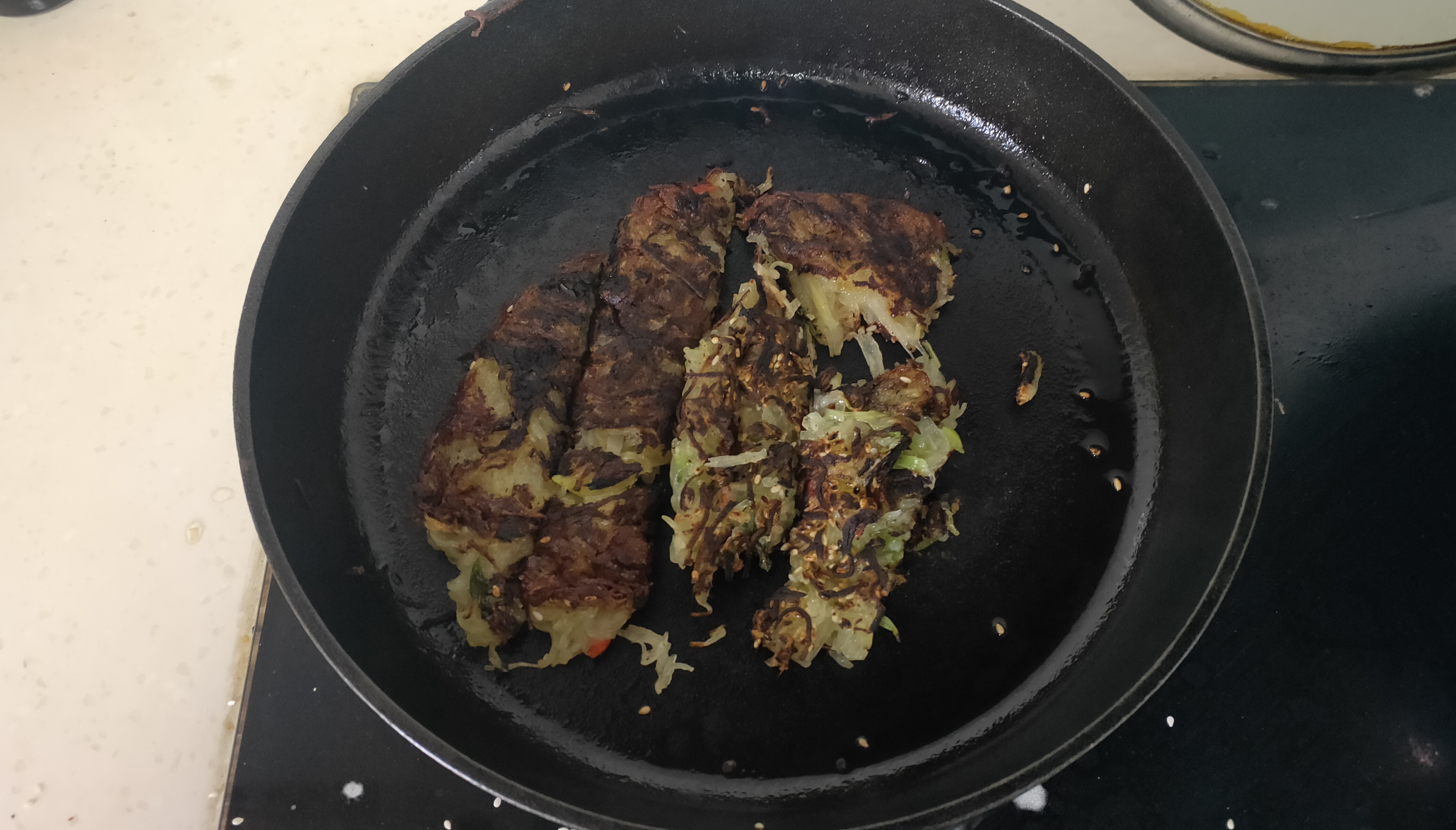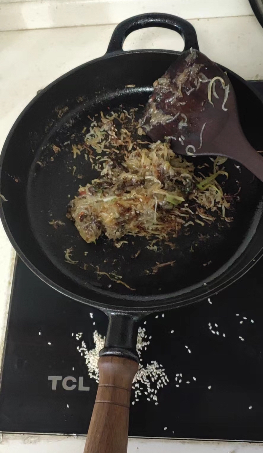 - 等待一分钟左右,饼成型,且边缘翘起,用锅铲松动