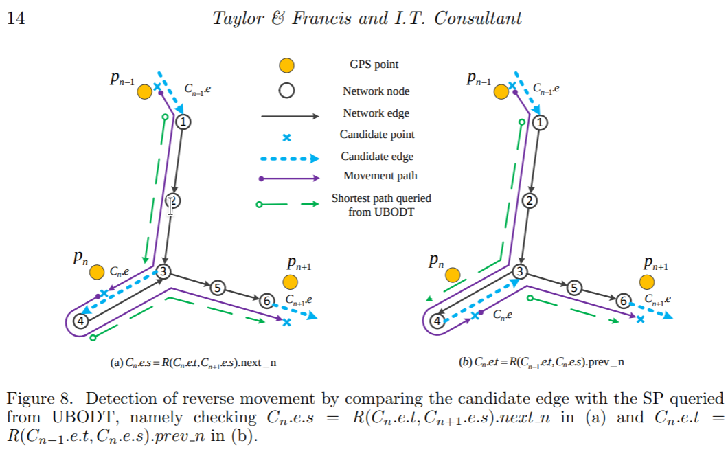 另一个是这两个轨迹点所匹配到的候选边之间的最短路径距,记为\(l_{n, n+1}^{C}\),具体计算方法如下 \[ l_{n, n+1}^{C}=\left\{\begin{array}{lc} C_{n+1} \cdot \lambda-C_{n} \cdot \lambda, & \text { if } C_{n} \cdot e=C_{n+1} \cdot e, C_{n} \cdot \lambda \leq C_{n+1} \cdot \lambda \\ C_{n} \cdot e . L-C_{n} \cdot \lambda+l_{n, n+1}^{N}+C_{n+1} \cdot \lambda, & \text { else } \end{array}\right. \]状态转移公式最终定义为 \[ t p\left(C_{n}, C_{n+1}\right)=\frac{\min \left(d_{n, n+1}, l_{n, n+1}^{C}\right)}{\max \left(d_{n, n+1}, l_{n, n+1}^{C}\right)} \]