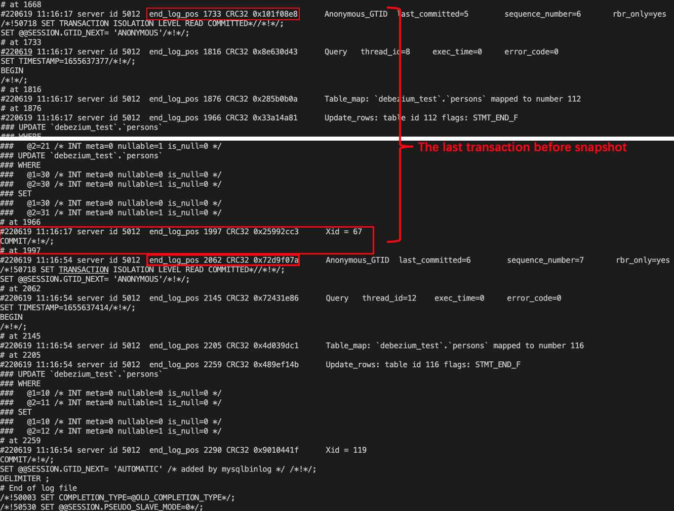 "file": "mysql-bin.000003", "pos": 1997 - The first transaction id after snapshot is