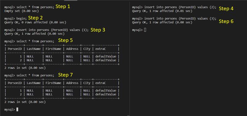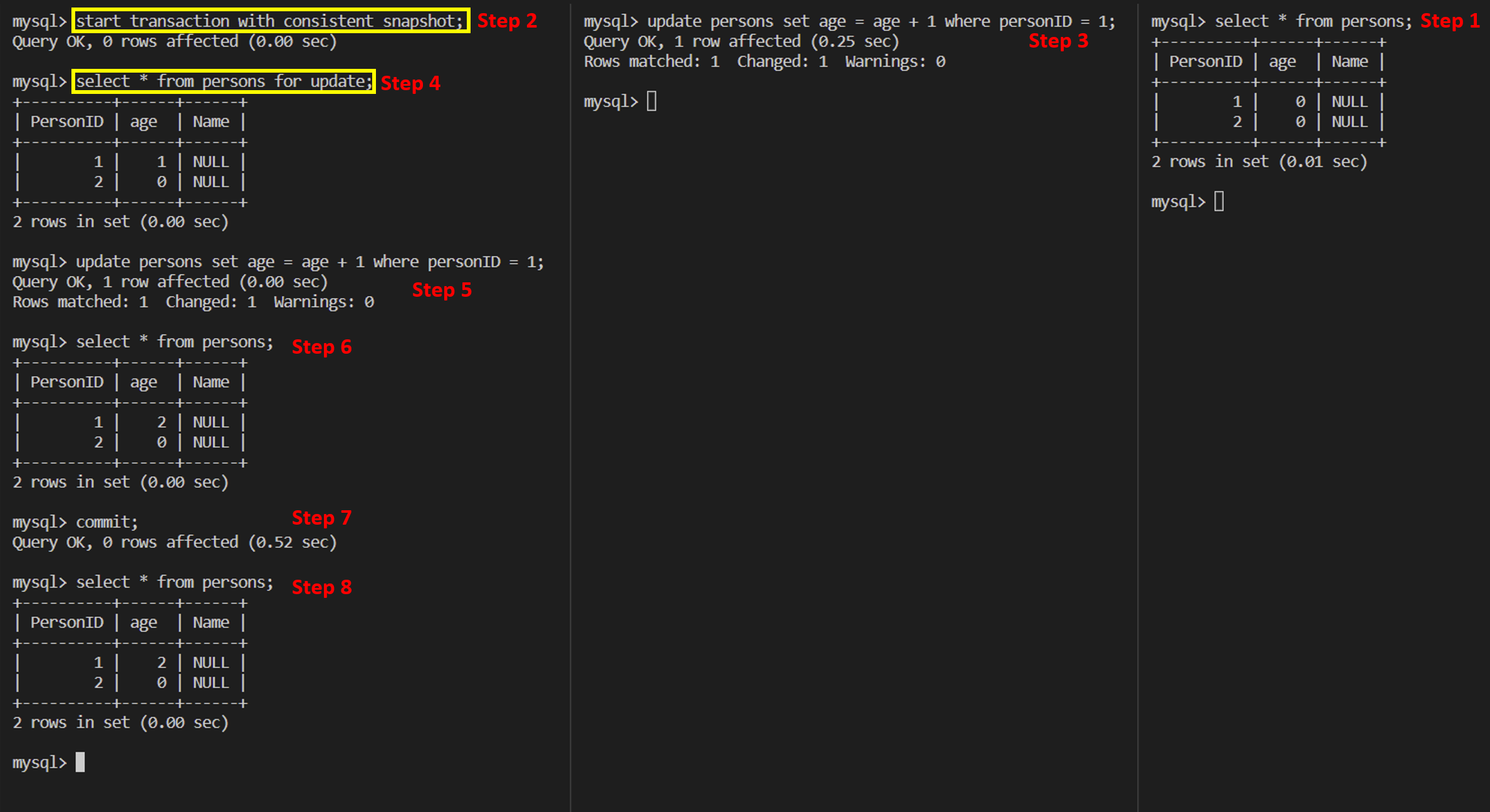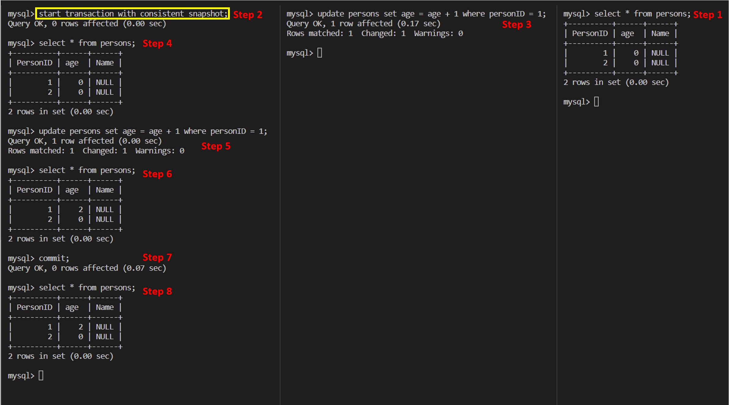 Based on the difference with snapshot read and current read, there is an interesting example. Through this example, please note that if you want to change data, you must use current read, but not snapshot read.
