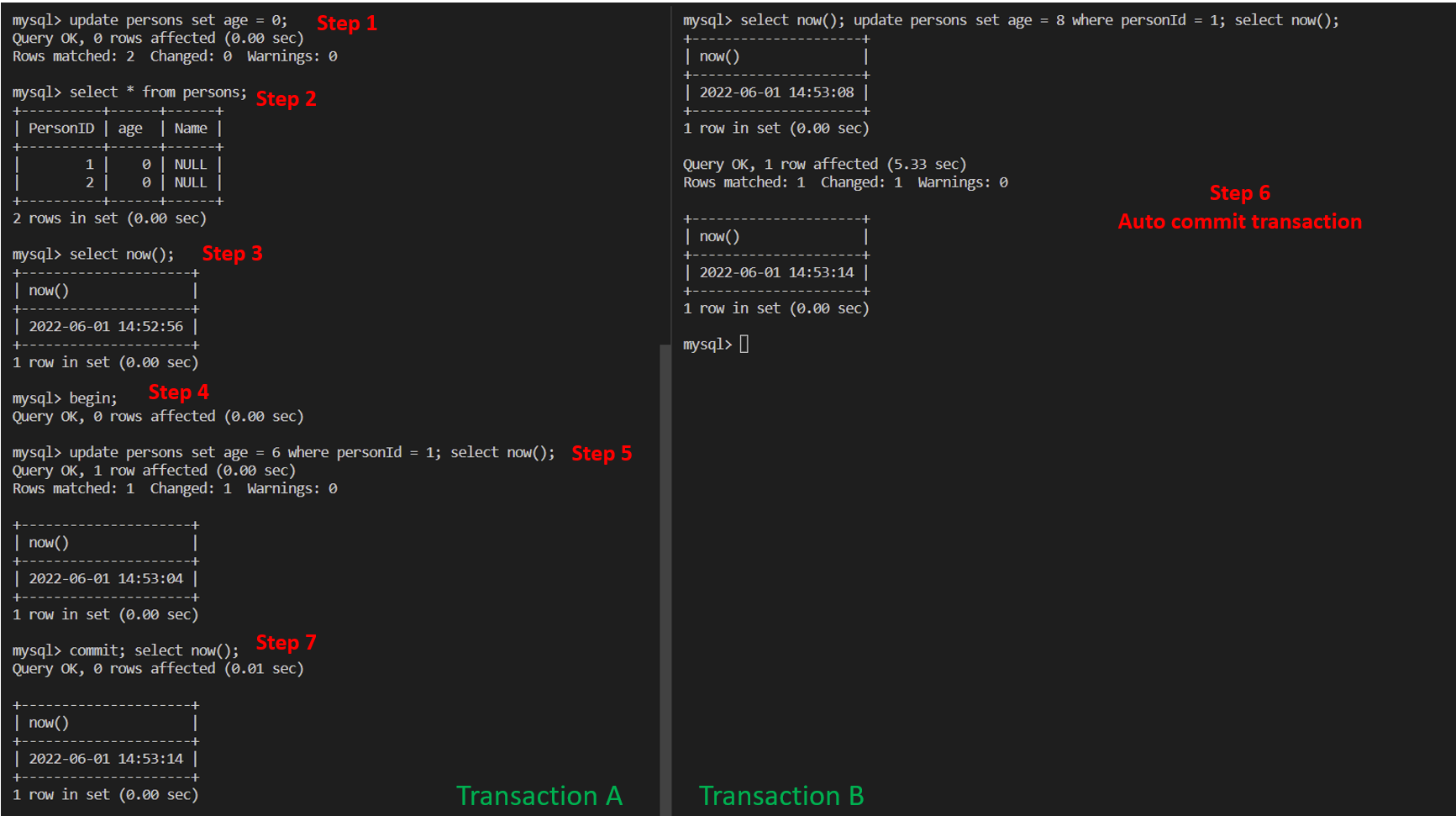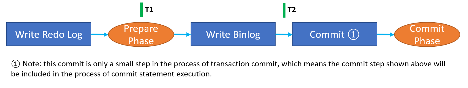 begin;The timestamp ofbeginis the same with first update statement start executing time.updateThe timestamp of this type statements are when the statements start executing.commitThe timestamp ofcommitis the time when executingcommitcommand.- The change events generated by Debezium only include the time of statements start executing, but not the transaction commit time which is very important for when other transactions can see the changes.