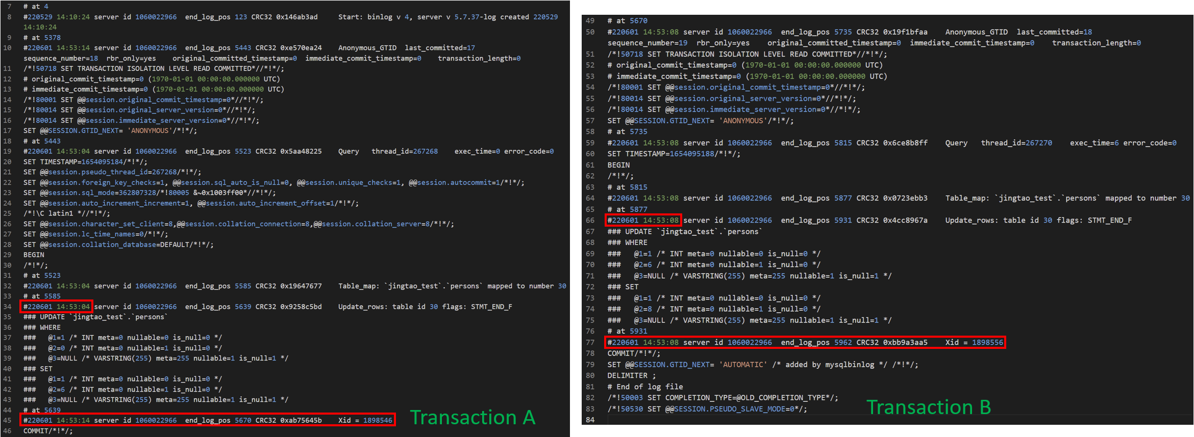 75 #220525 13:29:23 (This time is the same with transaction commit time) server id 1060022966 end_log_pos 1436 CRC32 0xcbc0cd7e Anonymous_GTID last_committed=4 sequence_number=5 rbr_only=yes original_committed_timestamp=0 immediate_commit_timestamp=0 transaction_length=0