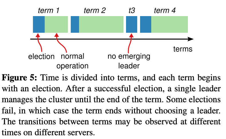 每一个term都从新的选举开始,candidate们会努力争取称为leader。一旦获胜,它就会在剩余的term时间内保持leader状态,在某些情况下(如term3)选票可能被多个candidate瓜分,形不成多数派,因此term可能直至结束都没有leader,下一个term很快就会到来重新发起选举。