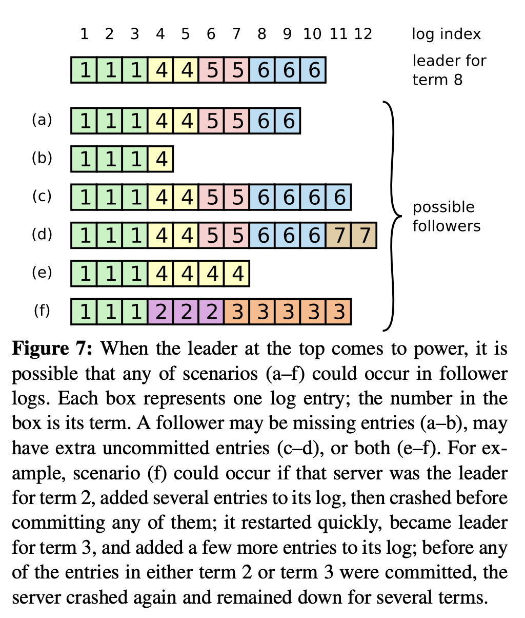 在集群经历过几次故障之后,可能会发生如下的情况,leader的日志没有被完全复制,leader中的日志也是不完整的,就会表现出看起来十分混乱的情况,甚至有些节点既有leader没有的日志,leader也有他没有的日志的情况。