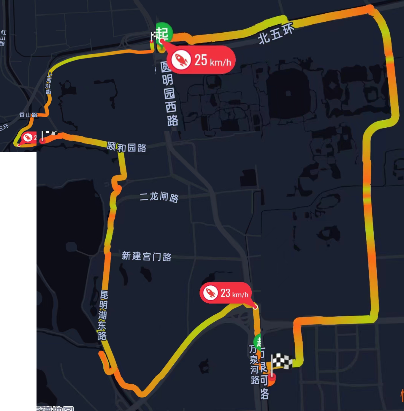 【骑行】周末骑行 Posted on 2022-05-23 Edited on 2022-07-12 In 生活 Views: 疫情防控越来越紧,为了强身健体,走出了家门,开始锻炼身体。 骑行路线 没有找到高德地图拼接多个足迹的功能,手动拼接了骑行路线。围着颐和园和圆明园转了个圈,总路程17公里,耗时90分钟 骑行拍照 小河流水,船桨翩翩。 古老的颐和园与蓬勃的新朝气 圆明园 清华大学 北京大学